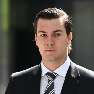 Footy legend Stephen Silvagni supports his visibly distressed wife Jo as they arrive for their 23-year-old son’s court hearing after he was convicted…